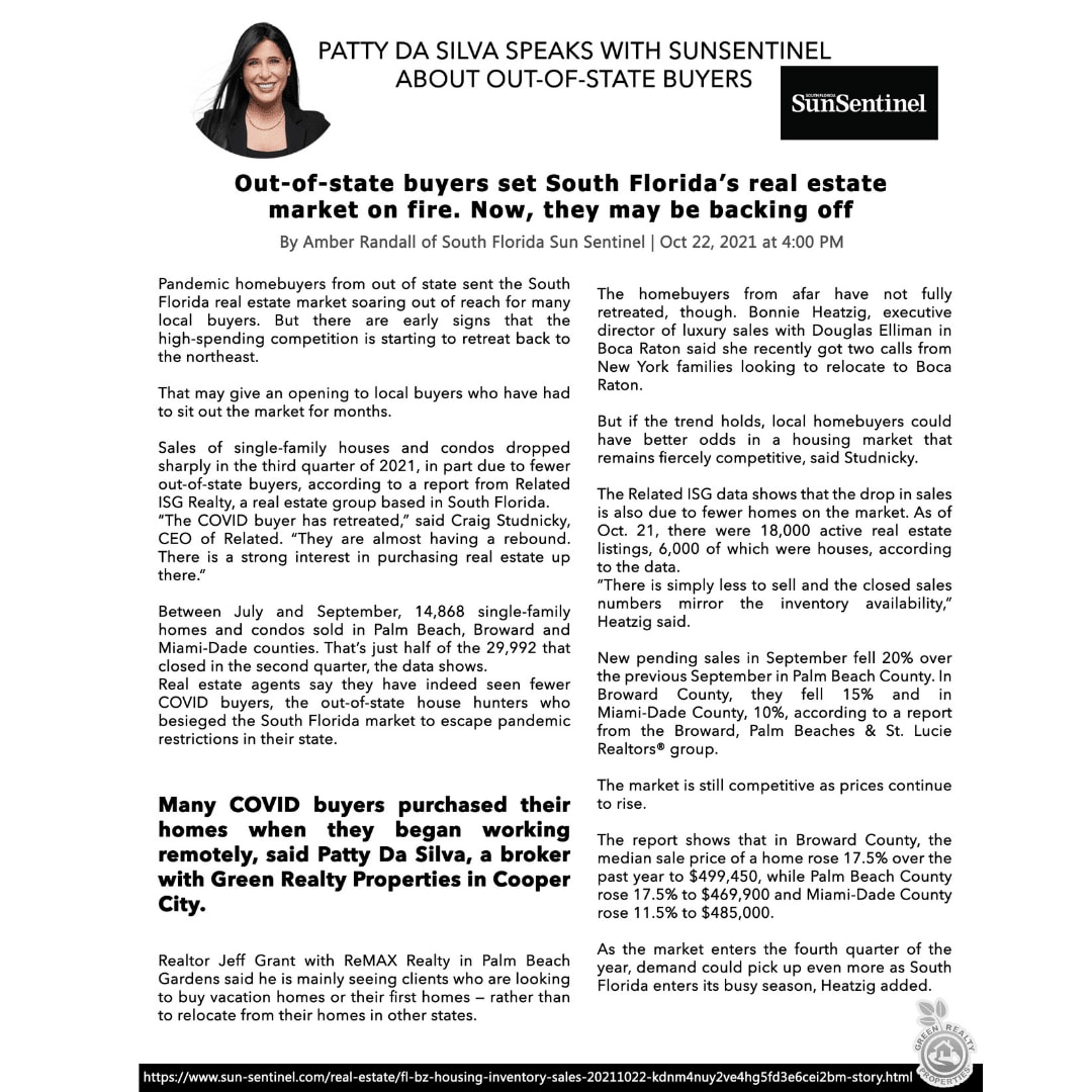 Broker Patty Da Silva had the pleasure of speaking with the Sun Sentinel about the effects of out-of-state buyers on the South Florida real estate market. Let's just say they have been setting it on fire, but may they be backing off ? Read on to find out more.